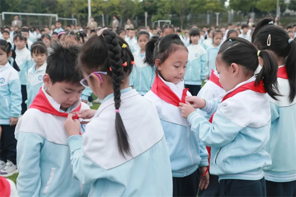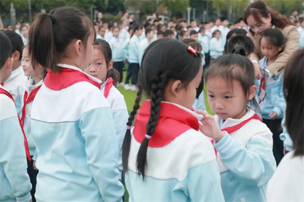 二年级优秀少先队员们捧着鲜艳的红领巾上前,指尖轻捏边角,认真为新队员系好绳结。当红领巾在胸前展开,新队员们悄悄摸了摸那抹红,同时抬手敬礼,稚嫩的脸庞上,自豪与庄重悄悄绽放。