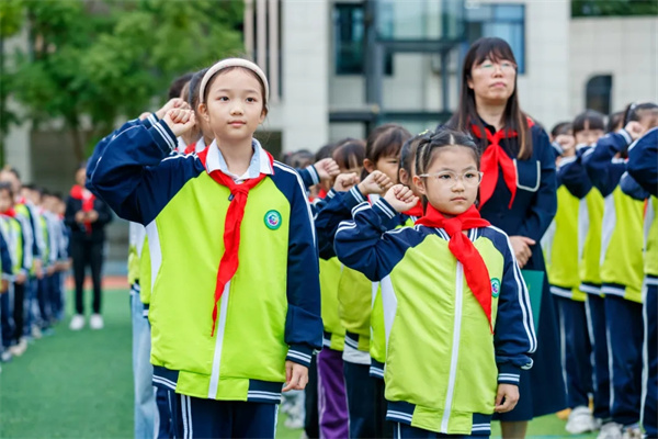 仪式在激昂的《出旗曲》中拉开序幕,鲜艳的中国少年先锋队队旗在旗手的护送下缓缓入场。全体少先队员肃立行队礼,预备队员行注目礼,目光紧紧追随着队旗,脸上写满了崇敬与向往。随后,嘹亮的中国少年先锋队队歌响彻校园,全体师生齐声高唱,激昂的旋律传递着新时代少年的蓬勃朝气与远大理想。