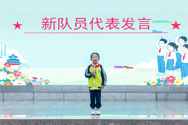 “我是中国少年先锋队队员,我在队旗下宣誓……”在大队长王滢茸的带领下,新队员们高举右拳,庄严宣誓。老队员们也一同重温了誓词,铮铮誓言回荡在校园上空,表达了新队员对少先队组织的忠诚与承诺,以及对未来成长的坚定信念。新队员代表二(11)中队祝圣姌上台发言,她激动地分享了成为少先队员的心情,并表达了将以实际行动践行誓言、为红领巾增光添彩的决心。