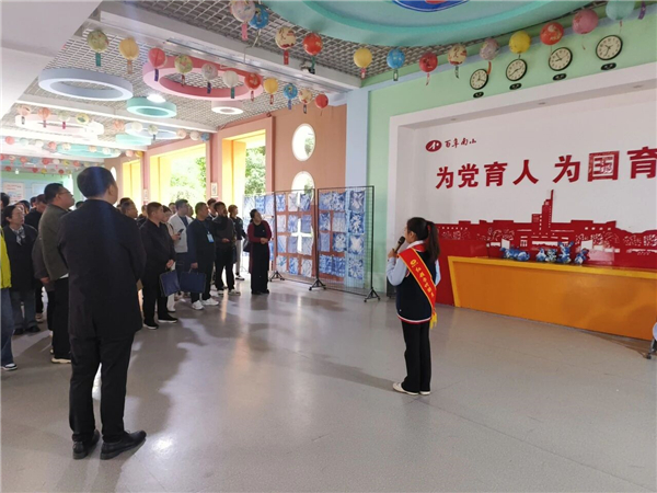 在一个个点位上,学校红领巾讲解员满怀自豪,向代表团介绍学校的办学历史、办学特色及办学成效,沿着校前广场至求真讲堂的路线参观校园。途中,南小同学们精美的书法作品和扎染作品让人流连驻足。
