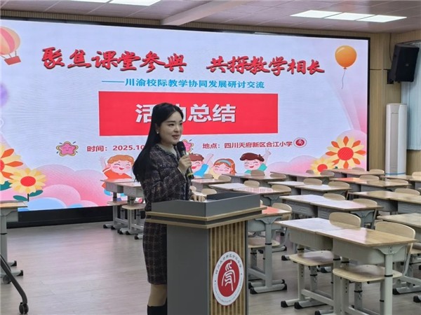 重庆两江新区金山教育集团副校长韩笑为本次活动作总结。她首先代表送教团队向合江小学的精心安排和热情接待表示诚挚感谢,并指出这次交流是深化合作的新起点,双方将以此为契机,共同探索教育协同发展新路径,为构建高质量教育体系、办好人民满意的教育贡献川渝教育人的智慧与力量。