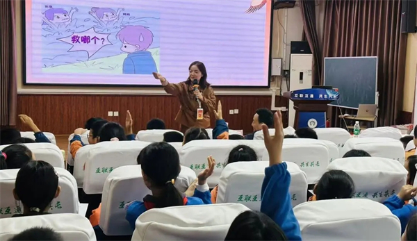 在热烈的掌声中,谢雯英开启宣讲。谢雯英从棋盘上的规则、法律的参天大树、法律生态圈、法制照亮人生四个方面进行讲解,宣讲内容生动易懂,让师生们深刻认识到,法律不是冰冷的条文,而是温暖的守护,既像保护自身的“铠甲”,也是指引行为的“灯塔”。
