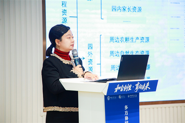 汇报中,万慧重点阐述了以“六面一体”为逻辑内核的共同体架构,通过价值引领、中心联动与机制保障,形成幼儿园主导、教师主体、家庭主责、社会参与的协同格局。结合实践案例,万慧进一步阐释了家园共育、课程共构、资源共建与人才共培四大中心的运作机制,展现了如何系统整合高校、社区与家长资源,形成从资源引入到课程实施环环相扣的实践路径,为新建园突破发展瓶颈、实现品质提升提供了可行模式。