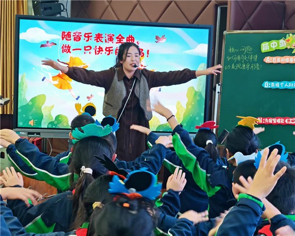 在音乐课堂上,吉玥琳以核心问题“如何用肢体律动表现音乐形象?”为引领,以问题串“歌唱比赛现场的气氛是怎样的呢?鸟鸣声有什么特点?什么乐器给小鸟伴奏呢?你能模仿它的声音吗?”为支架,并通过AI制作的学习视频赋能辅助课堂教学,呈现了一节着重凸显深度学习理念的小组合作学习示范课。