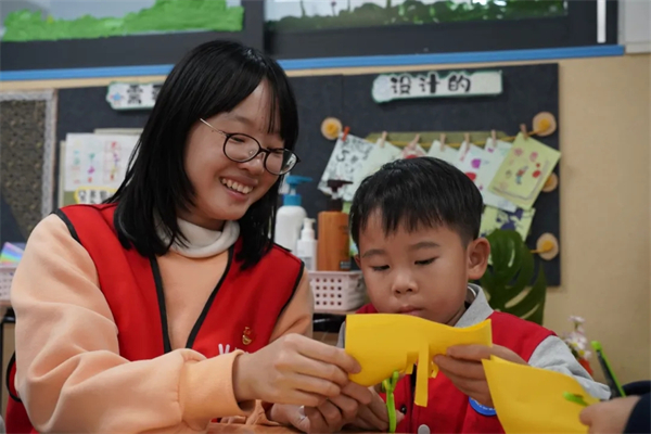 孩子们小心翼翼地摆放、粘贴,将平凡彩纸变为一颗颗胖嘟嘟的寿桃,以此表达最纯真的心愿。