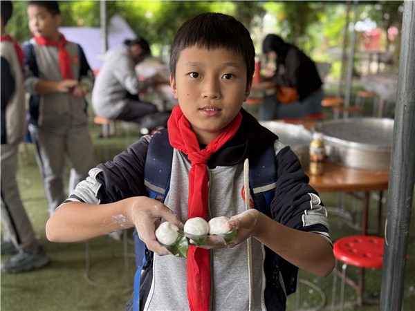 4-6年级的同学则沉浸在稻谷的海洋中,体验传统的农事收割。他们在老师的指导下收获稻谷,“打谷子时抬高、放下,使劲儿打,然后再翻过来抖一下。”一旁的老师细心地指导着动作要领。美食制作区内,同学们大展身手,学习制作崇州特色传统美食——叶儿粑。将馅料细心裹进糯米团,再用粑叶包裹成型,每一个步骤都一丝不苟。手工课上,同学们还体验了制作竹节人的乐趣。活动最后,4-6年级的同学们则挑战了需要更多团队协作的“通天塔”和“运转乾坤”项目。这些活动不仅考验体力,更考验团队协作能力和战略思维。赛场上,青春的活力与朝气尽情绽放。