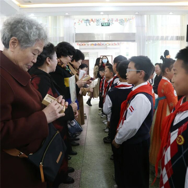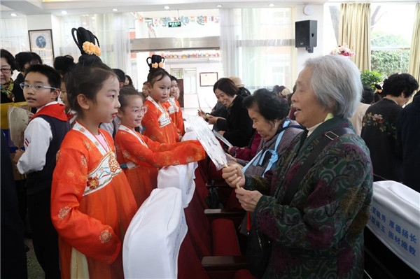 节目表演结束,学生代表们手捧着提前精心制作的礼物,双手递上并轻声道贺,“敬老爱老”的种子悄然种进了孩子们的心田。