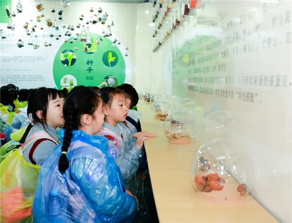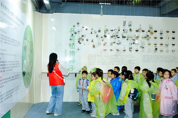 研学之旅的第一站,是种子博物馆。刚走进场馆,同学们便被琳琅满目的种子展品瞬间吸引:有比指甲盖还小的芝麻种子,有像小扇子一样的银杏种子,还有带着硬壳的板栗种子……讲解员老师用生动的语言,为孩子们讲述种子的基本结构和种类以及种子“旅行故事”——蒲公英靠风传播,苍耳靠动物皮毛“搭便车”,莲蓬的种子则随水流远行。孩子们睁大眼睛,有的还拿出小本子认真记录,仿佛在破译大自然的“生命密码”,也在心中种下了热爱自然的小种子。