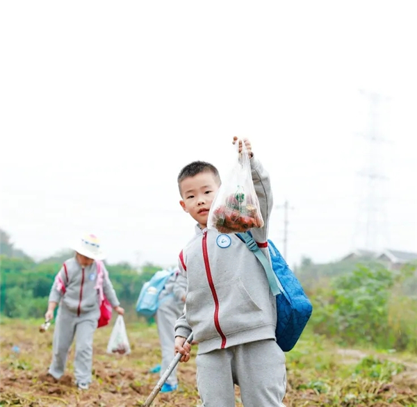 在挖红薯活动中,在田间搭建了临时避雨棚。来到棚下,看着绿油油的红薯藤,孩子们迫不及待地拿起小锄头,在老师的指导下开始挖掘。有的蹲在地上轻轻扒开泥土,有的小心翼翼地顺着藤条寻找红薯的位置,泥土偶尔沾到小手,大家笑着擦掉继续挖。当一个个裹着泥土的红薯从地里被“揪”出来时,瞬间响起阵阵欢呼。“我挖到一个大红薯啦!”“你看我的红薯像小灯笼!”孩子们举着自己的“战利品”互相炫耀,也在劳作中体会到了农民伯伯的辛苦与粮食的珍贵。