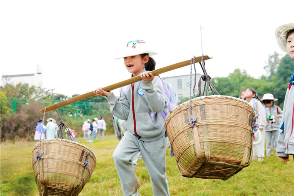 实践活动后,充满趣味的体验项目有序开展。挑箩兜活动同样吸引了大批孩子。看着两头挂着竹编箩兜的扁担,孩子们既好奇又兴奋,纷纷跃跃欲试。老师先示范正确的挑担姿势:双手扶着扁担,腰背挺直,脚步放慢。一开始,孩子们刚把扁担放在肩上,就因为重心不稳晃个不停,有的甚至差点把箩兜甩到地上,引得周围一阵笑声。但大家没有气馁,在老师的耐心指导下,终于能稳稳挑起箩兜,哪怕只走了短短几步,孩子们也欢呼雀跃,在用力的过程中,真切感受到了传统农具背后的劳动智慧。