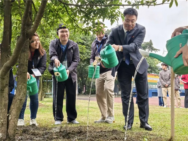 在学校操场旁边的“和融园”,王开宇简要讲话,并与代表团教师一起共植友谊树。王开宇讲到,川港一家亲,这种多元化的交流活动,不仅增进两地学校之间的友谊,更可以帮助师生开拓视野,面向世界,为迎接将来各种挑战作好准备。他希望川港两地学校今后加强互访与沟通,进一步推动两地学校的多元协作。