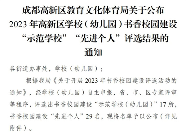 2023年,成都高新区教育文化体育局以“书香校园建设”为统领,以“阅读活动改革”为抓手,撬动全区学校阅读品牌创建,“书香校园建设”和“阅读活动改革”成果显著。1所学校被评为全国“书香校园”,3所学校被列为成都高新区“阅读活动改革试点学校”,17所学校被评为高新区“书香校园建设”示范学校,29名教师被评为书香校园建设“先进个人”。