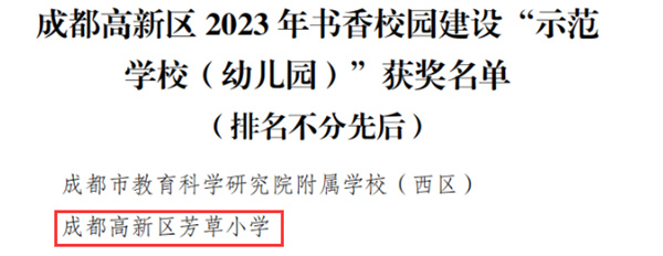 成都高新区芳草小学、中和中学、金融城幼儿园等17所学校和幼儿园不断探索书香校园建设有效途径,大力丰富书香校园建设资源,精心打造符合学校特色的书香校园建设模式,被评为成都高新区“书香校园建设示范学校”。