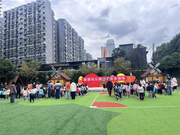 警报声响起后,在老师的带领下,孩子们用湿毛巾捂住口鼻,沿着预定路线有序排队、快速撤离,安全抵达指定地点,各班老师迅速清点人数,确保每位幼儿安全撤离。