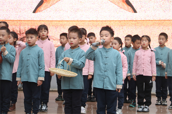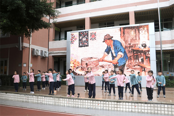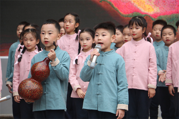 “风筝载着千年故事,蜀绣绣出巴山灵秀,漆艺映着商周光影,竹编缠着匠心温度……”二(一)中队的队员们正深情演绎着诗歌《非遗里的成都》。悠扬的诵读声与手中的非遗道具相融,如时光流淌,婉转间传递出非遗的厚重与文化的力量,生动展现了非遗文化代代赓续、焕发新生的独特魅力。