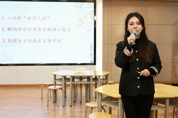 任思宇分享了“OK手势情绪约定+课后复盘”的引导策略——当孩子出现情绪敏感时,通过专属手势允许其短暂休息,课后共同复盘情绪来源,助其学会自我调节;邹卓君老师拆解了“停(降温情绪)-问(理解诉求)-教(社交技能)”的三步冲突调解法,帮学生区分“无意碰撞”与“故意攻击”,学会用语言替代拳头;吴若晗老师呈现了“师-生-家三方协同”模式——老师贴合学生爱好搭建分享平台,同学主动请教破冰,家长正向反馈,让学生学会从“用冲突对抗”转向“用温和表达”;胡丽苹老师介绍了“一分钟奇迹(累计安静时长重建自信)—预演安全出口(情绪疏导)—责任疗法(承担卫生检查任务培养自控)”的家校共育策略,用持续陪伴融化家庭沟通壁垒。