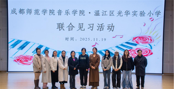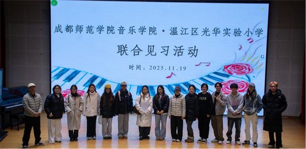 2025年11月19日,一场融合课堂展示、专题研讨与教育启发的音乐教育见习活动在成都市温江区光华实验小学(以下简称:光华实小)顺利开展。成都师范学院音乐学院2023级师范生走进一线教学现场,与在职教育工作者共同观摩课例、聆听讲座、参与主题班会及文艺展演,在多维互动中深入探索音乐教育的育人深度与情感温度。