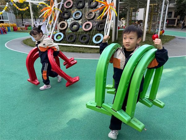 运动会的精彩,早已在晨间的“满园跑”中埋下伏笔。每周二、周四清晨8点20分,天府新区第六幼儿园的户外操场便成了孩子们的自由乐园,“联合体游”这趟“早班车”让大家踩着点入园,自由选择场域、玩法与同伴。孩子们化身游戏设计员、安全员、指导员,穿着小马褂在各个区域忙碌:设计员脑洞大开,将现有器材创生出花样玩法;安全员细心提醒,守护同伴安全;指导员热情鼓劲,帮助大家掌握运动技巧。