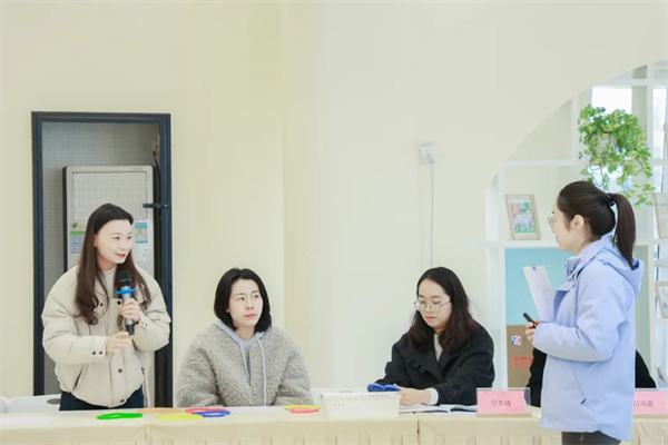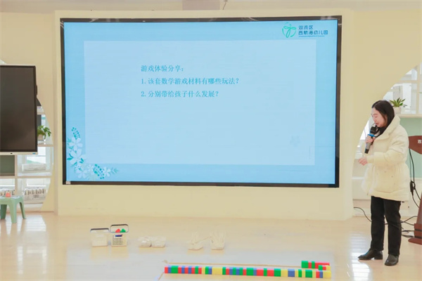 活动在有趣、生动的数学游戏体验环节中拉开序幕。与会者在保教办李冰雁老师的带领下,亲身体验了“盒子游戏”“跳远测量”“百变爱心”三套数学游戏材料。
