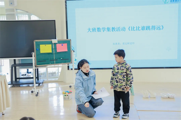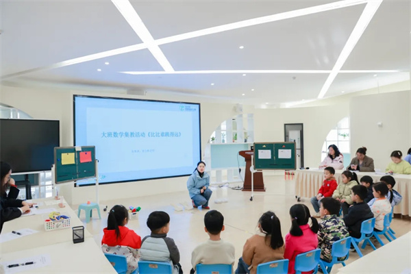 随后,黄定鲜老师组织了一场大班数学集教活动《比比谁跳得远》,通过解决跳远游戏中“谁跳得远?远多少?”的系列问题,游戏中的儿童自然掌握了非标准测量的基本方法,获得了比较远近、记录数据等经验。家长们观察到,孩子们不仅能够统一单位长度比较跳跃距离,更在探索不同的测量方法和表达表征中,呈现出数学思维的不断发展。