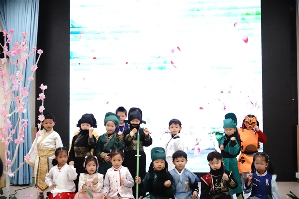 在唐松老师组织轻松愉快的互动游戏之后,大一班幼儿带来了情景剧《桃园三结义》新编,孩子们用纯真有趣的表演,重新诠释“承诺、友谊、共同理想”的深刻内涵,展现了中华优秀传统文化在学前教育中的有机融合与创新表达,精彩的表演赢得现场阵阵掌声。