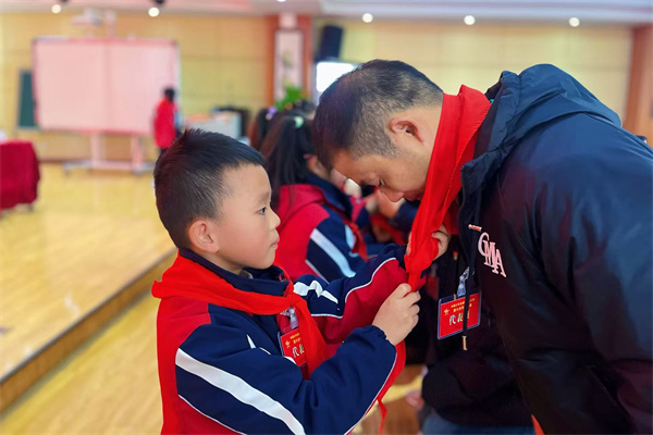 鲜艳的红领巾承载理想,寄托着美好的祝愿与期盼。队员代表为与会嘉宾佩戴上象征少先队员崇高荣誉的红领巾,与他们共享身为少先队员的光荣与喜悦。此刻,映照在大家坚定目光中的那一抹抹鲜红,成为会场中最动人的风景。