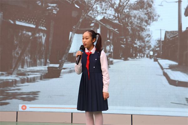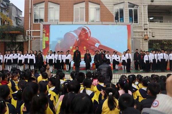 启动仪式上,稚嫩而嘹亮的歌声打破冬日宁静,一曲《校园普法歌》唱出了胜西学子对法律的尊崇。紧接着,学生代表钱妍伊伫立于国旗下,发表主题为《宽窄巷子里的宪法之光》的演讲,号召同伴们将法治信仰化为行动自觉。