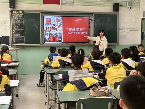 美术课上,创意迸发。孩子们化身小小“法治描绘者”,围绕“宪法保护我成长”主题挥舞画笔。稚嫩线条勾勒法治蓝图,斑斓色彩涂抹规则世界,一幅幅童趣作品成为对宪法最深情的告白。