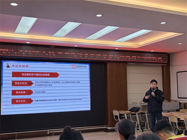 何鹏以《大力弘扬宪法精神,建设社会主义法治文化》为题,避开枯燥的法条堆砌,结合生动案例,深入浅出地剖析宪法与生活的联系。讲座现场互动频频,专业的法律解读打开了同学们心中的困惑,并在心中筑起一道坚固的法律防火墙。