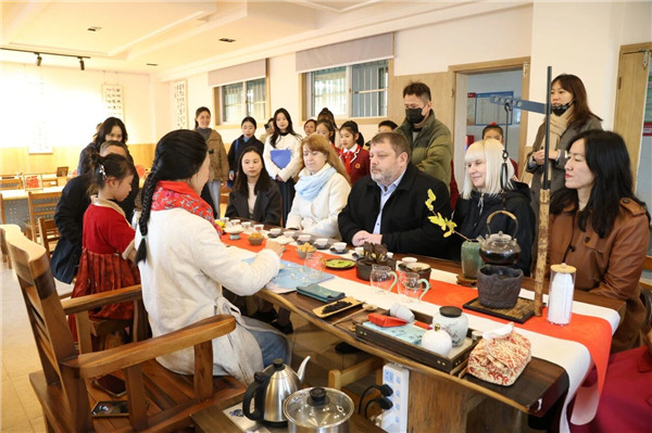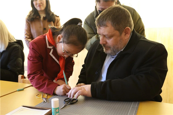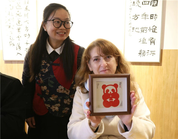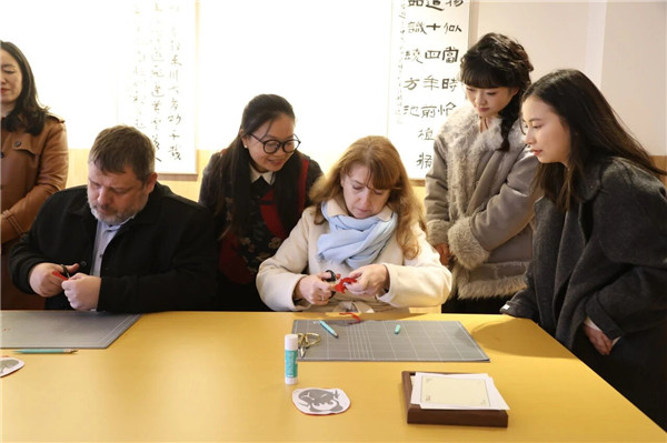 在剪纸课堂,尹华翠老师细心指导,客人们兴致盎然,动手创作,在一折一剪间感受中华民间艺术的精巧与趣味。
