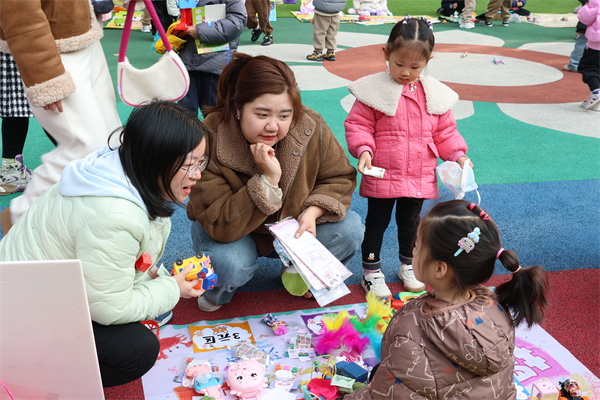老师们也兴致勃勃地加入这场热闹的集市,化身“大顾客”穿梭在各个摊位间。她们蹲下身和“小老板”们认真砍价,挑选着孩子们带来的小玩具、绘本和手工作品,时不时还会夸赞“小老板”们会做生意,逗得孩子们笑得合不拢嘴。