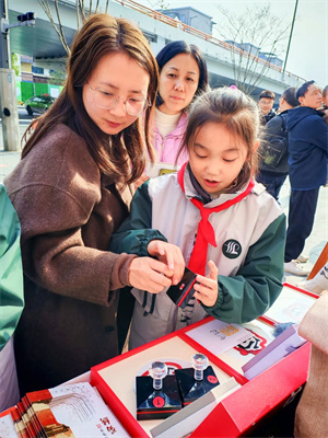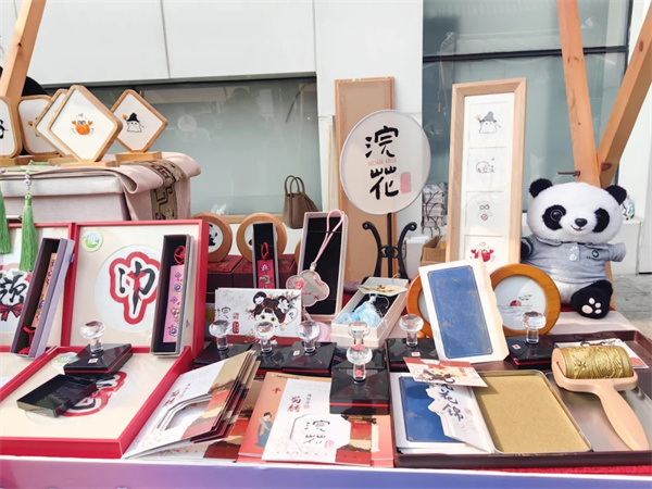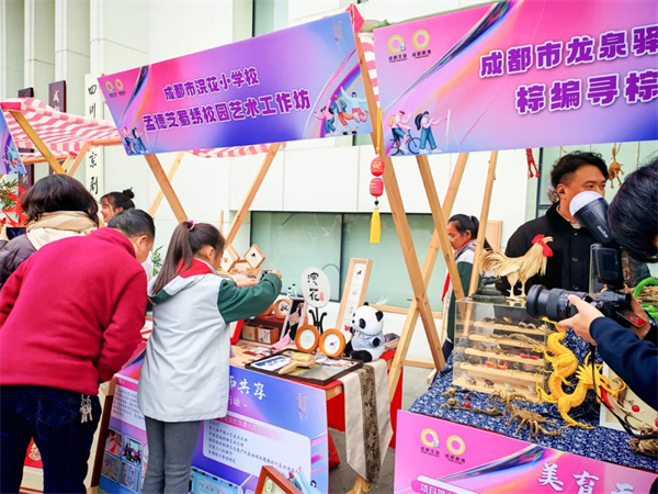 《党旗映初心》作为全省唯一小学蜀绣党建主题创作,平针绣制的党旗纹路清晰,红丝线流淌着少年爱国情,曾亮相青羊区文化馆展览;《熊猫戏竹》以孟德芝大师“施毛针法”为灵感,孩子们将丝线劈成细缕,绣出熊猫绒毛的蓬松质感,搭配银杏叶、川剧脸谱等川蜀符号,尽显地域韵味;蜀绣文创系列中绣制精美的书签、扇面,将传统技艺转化为日常美学,成为展演现场最受欢迎的“非遗伴手礼”。