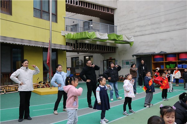 升旗仪式在活力满满的亲子热身舞中拉开序幕。大二班家长代表和孩子们一起跟着《细菌大作战》的欢快旋律摆动身体,“左拍拍,右拍拍,细菌病毒快走开;勤洗手,多通风,健康宝宝人人爱”。稚嫩的动作搭配家长的默契配合,不仅驱散了清晨的微凉,更让“主动对抗病菌”的理念通过肢体语言深深印在孩子们心中。