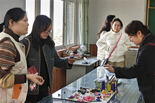 活动伊始,全体与会教师在元通小学副校长李云开的引导下参观了校园文化建设,并重点观摩了特色鲜明的软陶教室。室内陈列的丰富软陶教学素材、各年级学生的阶段性创作以及精美的主题手工艺品成果,生动展现了元通小学将软陶艺术融入日常美育与劳动教育的长期实践,为跨学科课程开发提供了直观而富有启发的现实场景。
