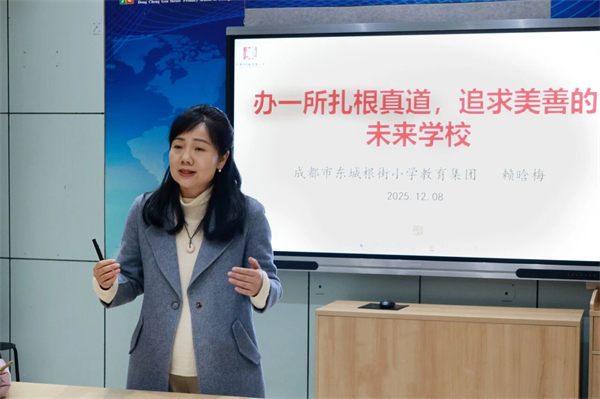 学校党总支书记、东城根街小学教育集团总校长赖晗梅以《办一所扎根真道,追求美善的未来学校》为题,系统阐述了学校“真教育”办学主张。赖晗梅从文化育人、治理优化、学习变革、教师成长到经验辐射,完整呈现了东城根街小学在文化积淀与未来追求中的实践路径与顶层思考,引发在场教育同仁深切共鸣。