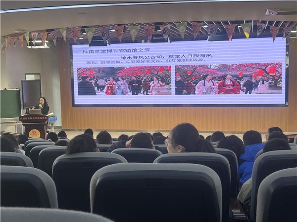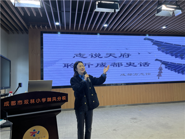 2025年12月15日下午,一场主题为“志说天府·聆听成都史话——唐代诗人的成都往事”的文化讲座在成都市双林小学御风分校的阶梯教室精彩开讲。本次活动特邀成都方志馆资深老师周丹丹主讲,为六年级的同学们带来了一次与历史对话、与诗歌相遇的文化之旅。