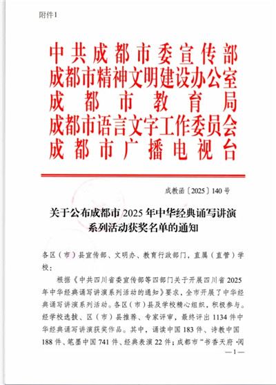 成都市2025年中华经典诵写讲演系列活动及成都东部新区区级评选活动自五月启动以来,成都东部新区三岔湖小学校学子展现出扎实的文化功底和出色的表现。近日,评选结果相继揭晓,该校在众多参赛队伍中脱颖而出,荣获市、区两级多项荣誉,绽放经典魅力!
