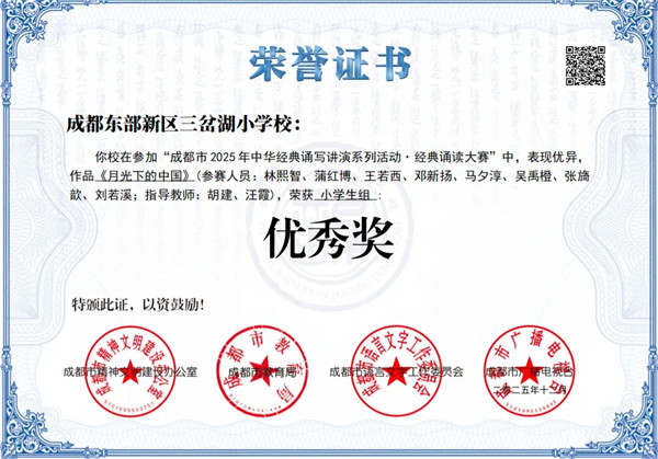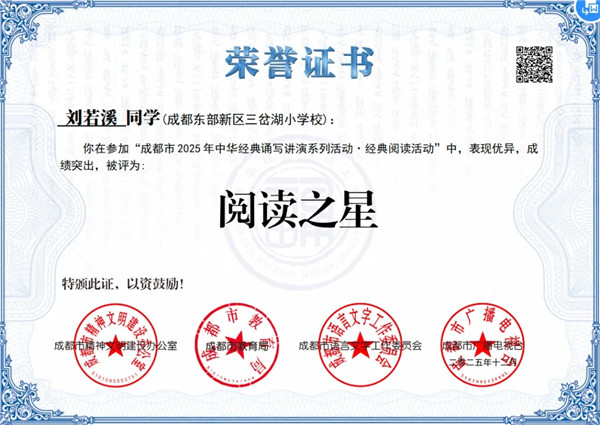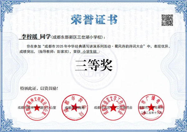 三岔湖小学学子林熙智、蒲红博、王若西、马夕淳、吴禹橙、张旖歆,刘若溪在成都市2025年中华经典诵与讲演系列活动—诵读经典中荣获成都市优秀奖;李梓瑶同学在蜀风诗韵诗词大会活动中荣获市级三等奖;刘若溪同学在成都市2025年中华经典诵与讲演系列活动中获阅读之星称号。