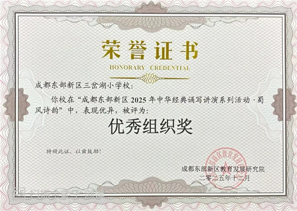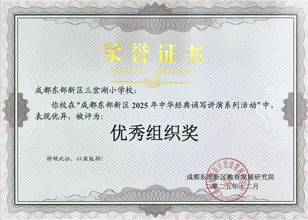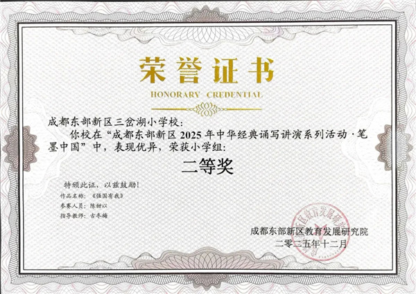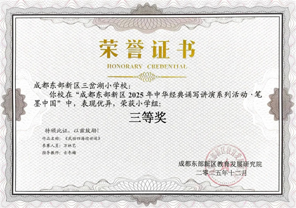 此次获奖是三岔湖小学校重视中华优秀传统文化教育的生动体现,也是师生们深耕经典、勤练不辍的成果。未来,学校将继续以经典为媒,开展更多丰富多彩的文化传承活动,让中华经典在校园落地生根、开花结果,助力学子在经典浸润中成长成才!(黄小林)
