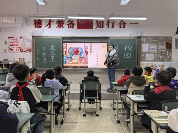 12月12日,各班开展了冬至主题班会。班主任带领孩子们穿越古今:从冬至“昼最短,夜最长”的自然特征,到“冬至大如年”的古老俗语;从《汉书》中“冬至阳气起,君道长,故贺”的历史记载,到南北方“吃汤圆、宰羊、包饺子”的饮食差异,一个个生动的传说、一段段有趣的民俗,让孩子们在聆听中了解了冬至的起源与文化内涵。