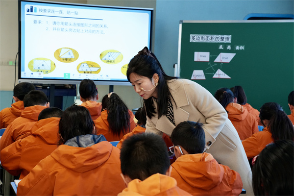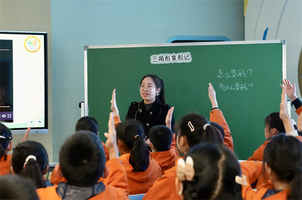 第二节课,金沙小学熊茜老师执教练习课《三角形变形记》。本节课以“三角形为什么变形?”“怎么变形?”两个问题为起点,通过“移动顶点,画出等积三角形”的活动,感悟“变形”原理,掌握“变形”方法。学生们从“识别等积”走向“创造等积”,不仅掌握了“等积变形”的方法,更深刻体会到“转化”思想在解决复杂几何问题中的强大作用。