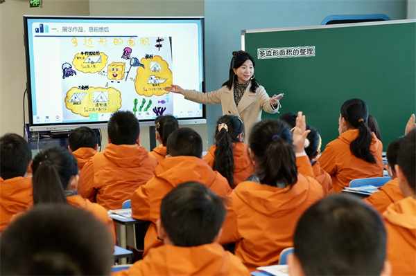 第一节课,金沙小学韩俊霞老师执教《多边形面积的整理》复习课,以“转化思想”为核心,立足数与形双重视角,从学生绘制的思维导图切入,聚焦底、高、面积三大核心要素。通过小组合作、自主构图等活动,构建起图形转化知识网络,驱动学生经历“观察—猜想—验证”全过程,助力学生从“零散记忆”迈向“系统理解”。