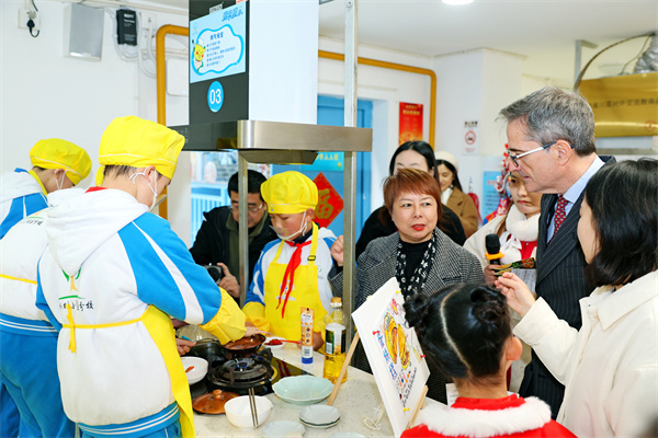 随后,嘉宾移步至学校“泡家厨房”。泡小西区分校“泡家厨房”课程已有18年历史,构建了“四四二一”川菜技能体系,形成了覆盖六个年级劳动实践课程,引导学生从餐桌礼仪到美食烹饪,从技能学习到文化理解,全面树立劳动观念、提升劳动能力。作为“川菜文化对外交流教育基地”,学校已与川菜对外交流协会合作,先后举行了“川菜文化推广大使评选”“中日美食文化交流”“中奥美食文化交流”“中西美食文化交流”等活动,旨在搭建以劳动教育为核心,烹饪为媒介的中外人文交流桥梁,让孩子们感知全球美食文化,深入了解巴蜀文化,从劳动教育中学会爱自己、爱家人,从推广活动中学会爱家乡、爱祖国。