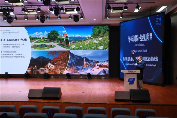 总领事雷君山介绍了奥地利位于欧洲中部的地理位置,谈到美食时,他还生动描述了维也纳炸牛排的酥脆、萨赫蛋糕的醇厚,以及奥地利咖啡文化的独特仪式感。
