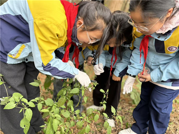 此刻的湿地变成了一个大型游乐场,孩子们都是“小小探险家”。秋千荡起来的时候,仿佛能碰到软绵绵的云;竹林边孩子们踮起脚尖,偷听竹叶说悄悄话。放大镜下面,叶子变成了一张张地图,泥土的缝隙间,悄悄躺着几颗透明的虫卵。蹲下来,田埂边,孩子们认识了一旁静静生长的小麦、胡豆秧,也小心翼翼地避开“会挠人”的荨麻。