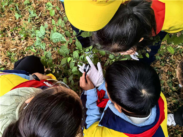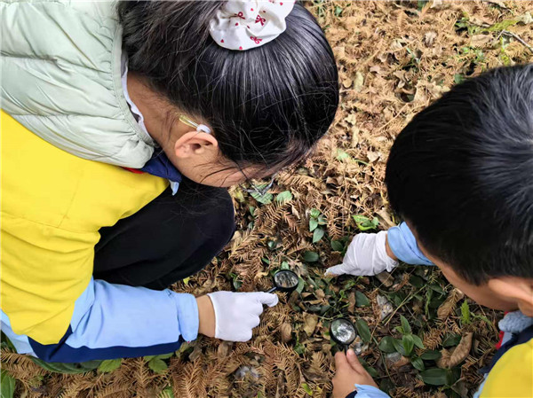 “快闻,这片叶子是香的!”“那棵树的叶子怎么那么长,像小鸟的羽毛。”“这是七星瓢虫的虫卵吗?”“竹子的笋壳上为什么有那么多细毛?”