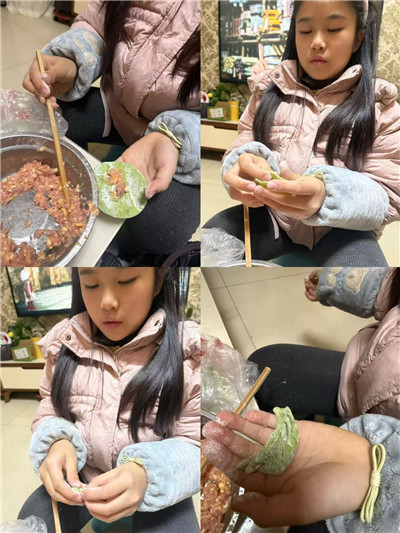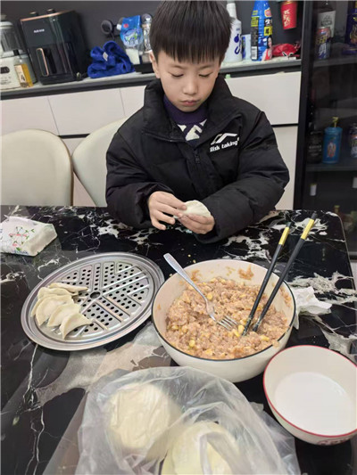 三、四年级的活动充满了烟火气与家庭温情。同学们将课堂延伸至厨房,与家人一同动手,体验冬至的“食”俗。揉面、擀皮、包馅,一只只形状各异的饺子在稚嫩的巧手下诞生。