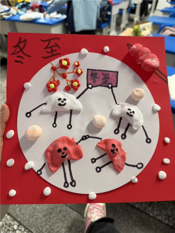 五、六年级的同学们则充分发挥想象力与创造力,用艺术形式诠释心中的冬至。他们或提起画笔,描绘出银装素裹的冬至景象、阖家团聚的暖意场景;或巧用黏土,捏塑出栩栩如生的饺子、汤圆等节日元素;更有创意者,制作起别致的“橘子灯”,让温暖的烛光点亮冬日。一件件充满童真与匠心的作品,不仅是艺术创作的成果,更是同学们对冬至文化理解与情感的立体表达。