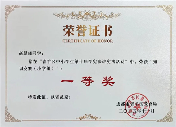 经区级选拔推荐,赵晨曦又代表学校参加第十届成都市学生“学宪法 讲宪法”活动,在素养竞赛(小学组)市级评审中,她继续发挥优势、沉稳应答,灵活运用法治知识,展现出优异的法律素养和综合能力,最终斩获市级一等奖。