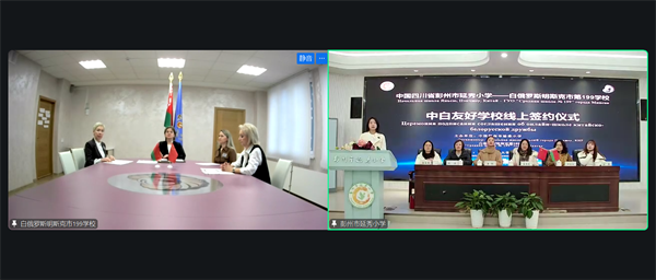 为弘扬中华优秀传统文化,拓宽学生国际视野并提升跨文化交流能力,2025年12月22日,彭州市延秀小学与白俄罗斯明斯克第199学校成功举行中外人文交流共建项目友好学校线上签约仪式。双方校长、教师通过云端相聚,共同见证了这一重要时刻。